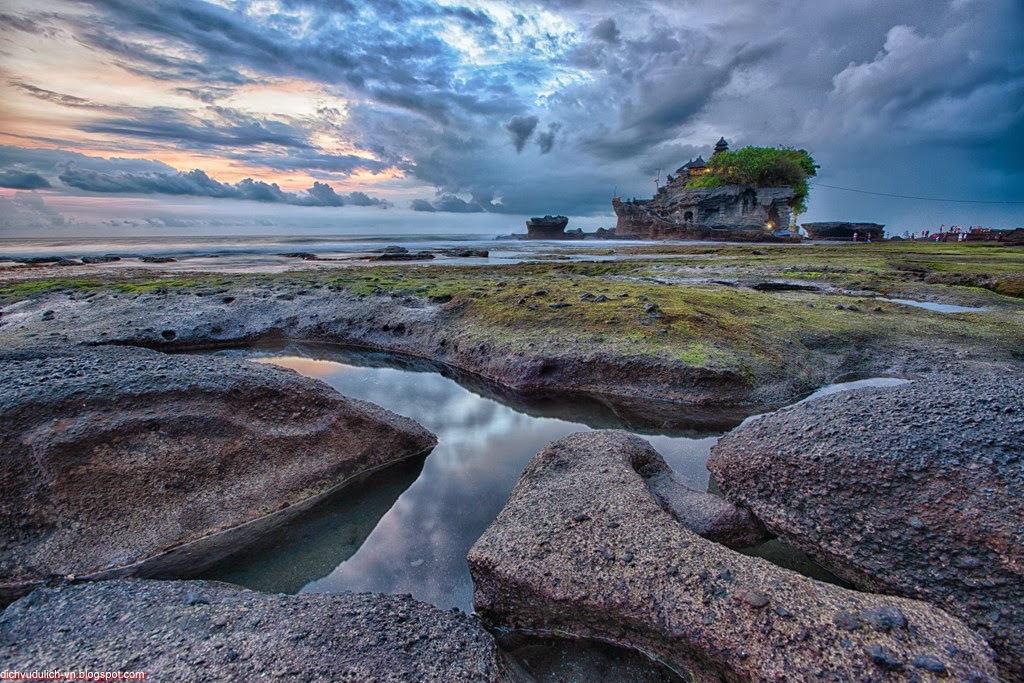 Ngôi đền Tanah Lot được xây trên đỉnh của một hòn đá khổng lồ giữa bốn bề biển xanh, sóng vỗ rì rầm và cách bờ biển Pura Tanah Lot bởi một lối đi nhỏ. Khi thủy triều xuống, các tín đồ Hindu xếp hàng dài, bước trên những phiến đá tiến vào dâng lễ, những người ngoại đạo vào lễ cũng được phết lên tóc một ít nước thánh, đính lên trán những hạt gạo, cài lên tóc một bông sứ trắng.
